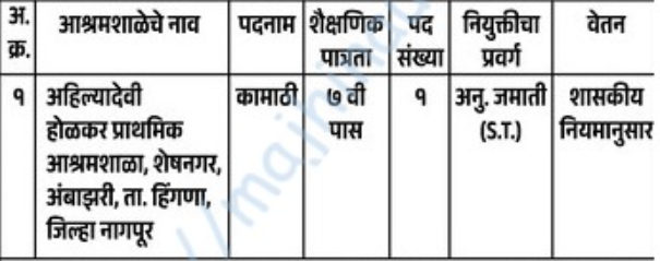 - मुलाखतीचे ठिकाण – अहिल्यादेवी होळकर प्राथमिक आश्रमशाळा, शेषनगर, अंबाझरी, हिंगणा, जि. नागपूर – ४४१११०.