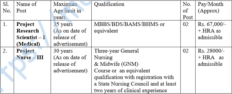 | या पदांसाठी भरती | १) प्रकल्प संशोधन वैज्ञानिक-I (वैदयकीय) २) प्रकल्प परिचारिका-III |