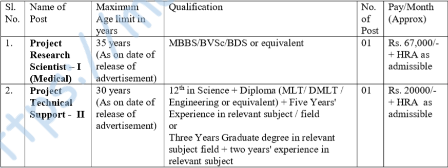 • १) प्रकल्प संशोधन वैज्ञानिक III (वैदयकीय) – ४५ वर्षे.