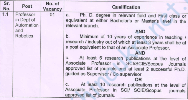 | या पदांसाठी भरती | प्राध्यापक – डिपार्टमेंट ऑफ ऑटोमेशन अँड रोबोटिक्स |