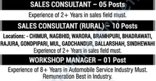 या पदांसाठी भरती | १) विक्री सल्लागार २) वर्कशॉप मॅनेजर |