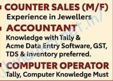 - Posts’ name – 1) Counter Sales (M/F) 2) Accountant 3) Computer Operator