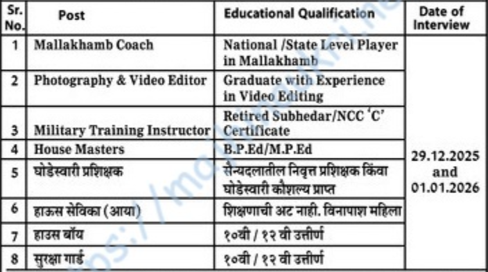 मुलाखतीची तारीख आणि वेळ दि. २९/१२/२०२५ आणि दि. १/१/२०२६ रिपोर्टींगची वेळ – सकाळी १०.०० वाजता.