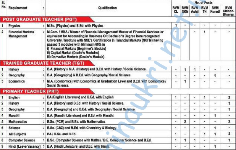 BVB Nagpur Recruitment 2026 – Bharatiya Vidya Bhavan’s Bhagwandas Purohit Vidya Mandir, Nagpur invites Offline applications till last date 16/4/2026 for the various Teaching & Staff posts for their centers at Civil Lines, Shrikrishna Nagar, Ashti, Trimurti Nagar, Koradi, Chinchbhuwan. There are total 49 vacancies. The job location is Nagpur. The Official website & PDF/Advertise is given below.