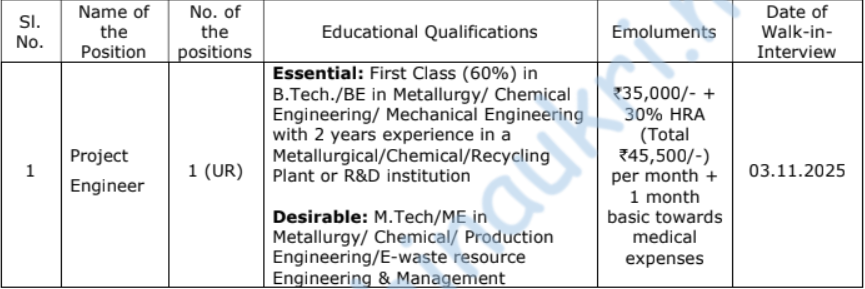 या पदांसाठी भरती प्रकल्प अभियंता शैक्षणिक पात्रता आणि अनुभव (शैक्षणिक पात्रताकरिता तक्ता पहा/PDF/वेबसाईट बघावी) – एकूण पद संख्या १ जागा नोकरीचे ठिकाण हैदराबाद अर्ज पद्धती ऑफलाईन मुलाखतीची तारीख आणि वेळ दि. ३/११/२०२५ नोंदणीची वेळ सकाळी ९.०० ते सकाळी १०.००.