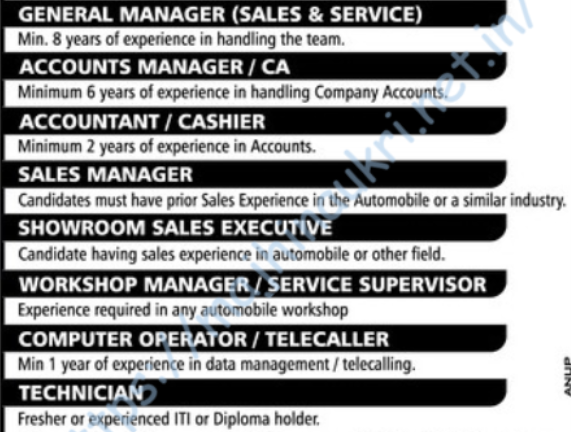 | या पदांसाठी भरती | १) सरव्यवस्थापक (विक्री व सेवा) २) सनदी लेखापाल/लेखा व्यवस्थापक ३) लेखापाल/रोखपाल ४) विक्री व्यवस्थापक ५) शोरूम विक्री कार्यकारी ६) कार्यशाळा व्यवस्थापक/सेवा पर्यवेक्षक ७) तंत्रज्ञ ८) कॉम्प्युटर ऑपरेटर/टेलीकॉलर |