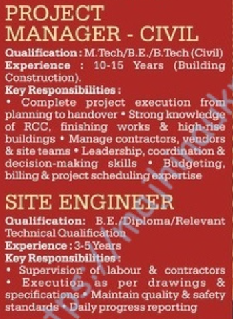 | या पदांसाठी भरती | १) प्रकल्प व्यवस्थापक (स्थापत्य) २) साईट इंजिनिअर |