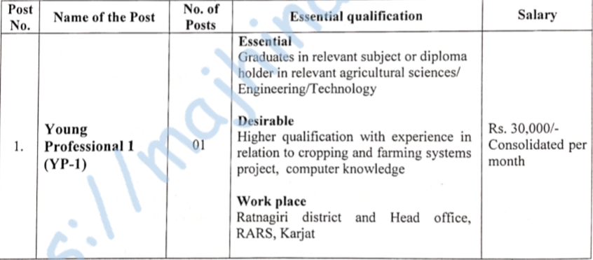 - मुलाखतीचे ठिकाण – सहयोगी संचालक-संशोधन यांचे कार्यालय, प्रादेशिक कृषी संशोधन केंद्र, जि. कर्जत – ४१०२०१, जि. रायगड.