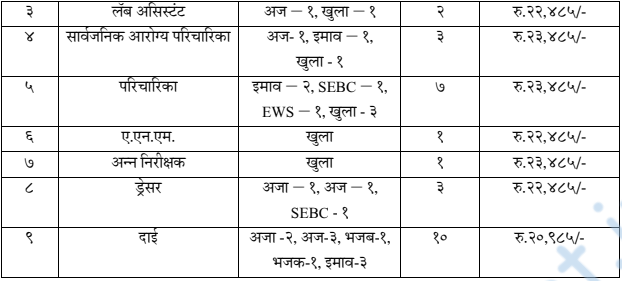 | अर्जाची शेवटची तारीख | दि. ३/१०/२०२५ सकाळी १०.३० ते संध्याकाळी ५.००. (कार्यलयीन कामकाजाच्या दिवशी) (एएनएम पदासाठी) |