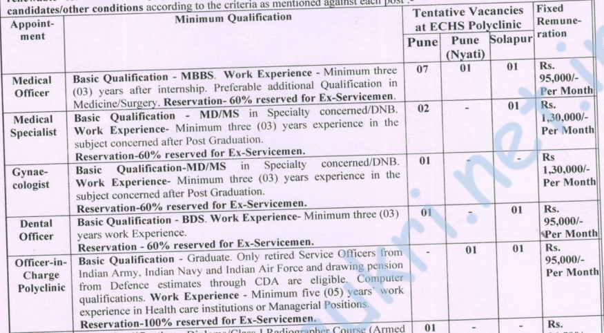 - For detailed information about selection procedure, terms & conditions, application procedure, prescribed format application, other instructions etc. about above posts ref. PDF/visit website – https://echs.gov.in/ contact Stn HQ (ECHS Cell), Pune at Mob. No. – 8806048042.