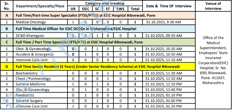 - मुलाखतीचे ठिकाण – कामगार राज्य विमा सोसायटी, बिबवेवाडी, पुणे, सर्व्हे नं. ६९०, बिबवेवाडी, पुणे – ३७.