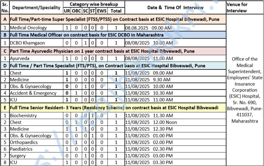 ESIC Pune SS/S/SR/MO Recruitment 2025 – Employees’ State Insurance Corporation Hospital, Pune invites Offline applications in prescribed format & has arranged an interview on date 08/08/2025 & 11/08/2025 for the posts of Super Specialist, Specialist, Senior Resident, Medical Officer & Part Time Ayurvedic Physician at ESIC Hospital Bibvewadi, Pune and Dispensary Cum Branch Office (DCBO) (for Medical Officers). There are total 18 posts. The job location is Bibvewadi, Pune. The Official website & PDF/Advertise is given below.