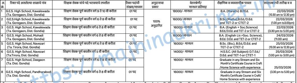 या पदांसाठी भरती शिक्षण सेवक शैक्षणिक पात्रता आणि अनुभव शैक्षणिक पात्रताकरिता जाहिरात बघावी. एकूण पद संख्या ८ जागा नोकरीचे ठिकाण गोंदिया. अर्ज पद्धती ऑफलाईन – नोंदणीकृत टपाल/व्यक्तिशः. अर्ज करण्यासाठी अंतिम तारीख दि. २८/२/२०२६ सकाळी ११.०० ते दुपारी ४.००. (तक्ता पहा/जाहिरात बघावी)