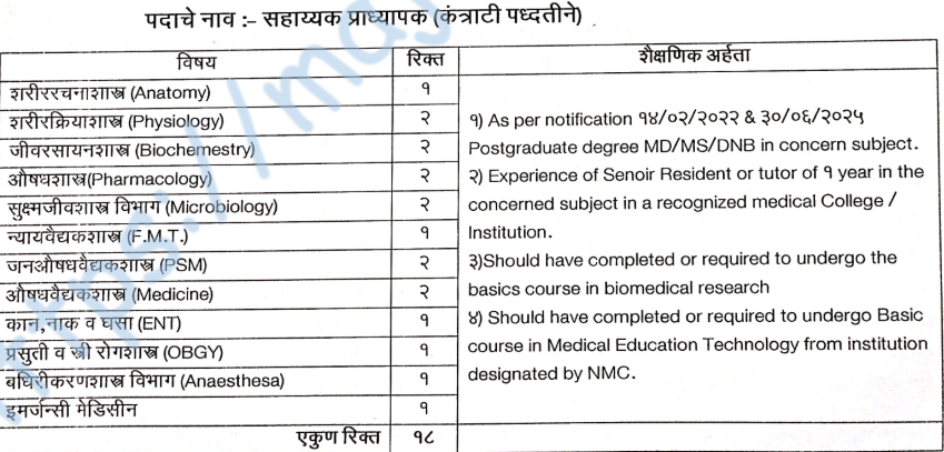 अधिष्ठाता, शासकीय वैदयकीय महाविदयालय, अमरावती यांनी प्रसिद्ध केलेल्या जाहिराती नुसार येथे विविध विषय सहाय्यक प्राध्यापक पदभरतीसाठी विहित नमुन्यातील ऑफलाईन अर्ज मागवून दर महिन्याच्या प्रत्येक बुधवारी रिक्त पदभरती होईपर्यंत मुलाखत आयोजित आहे. या भरती अंतर्गत एकूण १८ जागा आहेत. अधिकृत वेबसाईट आणि PDF जाहिरात लिंक खाली दिलेली आहे. “माझी नोकरी” या लिंक वरून टेलिग्राम चॅनल लगेच जॉईन करा.