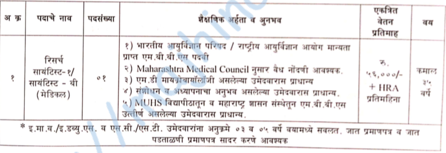 - १) संशोधन वैज्ञानिक/वैज्ञानिक-ब (वैद्यकीय) – रु. ५६,०००/- दरमहा