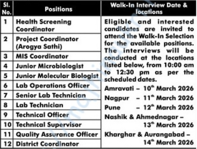 एचएलएल लाइफकेअर लिमिटेड यांनी प्रसिद्द केलेल्या जाहिराती नुसार महाराष्ट्र येथे हिंदलॅब प्रकल्पासाठी विविध पदभरतीसाठी विहित नमुन्यातील ऑफलाईन अर्ज मागवून दि. १०/३/२०२६, दि. ११/३/२०२६, दि. १२/३/२०२६, दि. १३/३/२०२६ आणि दि. १४/३/२०२६ रोजी मुलाखत आयोजित केली आहे आणि कन्सल्टन्ट पॅथॉलॉजिस्टस/विशेषज्ञ पदभरतीसाठी दि. ३१/३/२०२६ पर्यंत ऑनलाईन अर्ज मागवण्यात येत आहेत. अधिकृत वेबसाईट आणि PDF जाहिरात लिंक खाली दिलेली आहे. “माझी नोकरी” या लिंक वरून टेलिग्राम चॅनल लगेच जॉईन करा.