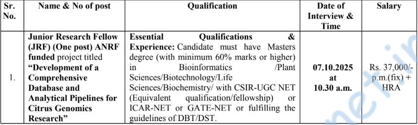 ICAR-CCRI Nagpur JRF Job 2025 – Indian Council Of Agricultural Research – Central Citrus Research Institute, Nagpur has arranged an interview on the date 7/10/2025 for the post of Junior Research Fellow (JRF). There is 1 vacancy. The job location is Nagpur. The Official website & PDF/Advertise is given below.