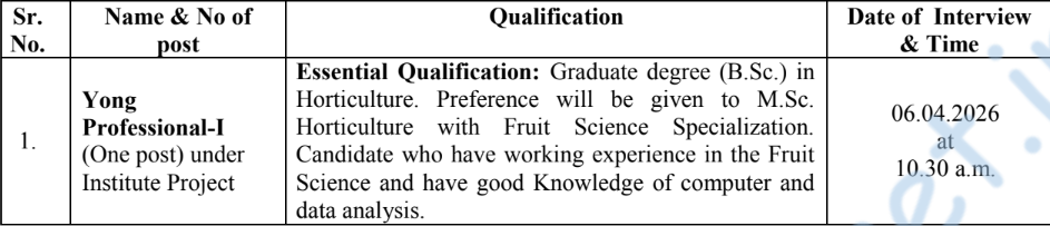ICAR-CCRI Nagpur YP-I Job 2026 Indian Council Of Agricultural Research – Central Citrus Research Institute, Nagpur invites Offline applications & has arranged an interview on the date 6/4/2026 for the post of Young Professional–I. There is 1 vacancy. The job location is Nagpur. The Official website & PDF/Advertise is given below.