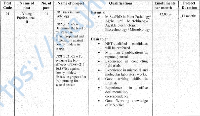 - Address for applications – Principal Scientist & Project Incharg, ICAR- National Research Centre for Grapes, P.B. No. 3, Manjari Farm Post, Solapur Road, Pune- 412307, Maharashtra.