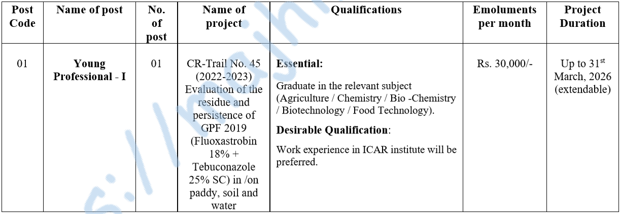 भारतीय कृषी संशोधन परिषद – राष्ट्रीय द्राक्ष संशोधन केंद्र, पुणे यांनी प्रसिद्द केलेल्या जाहिराती नुसार येथे प्रकल्प अंतर्गत यंग प्रोफेशनल-I (YP-I) पदभरतीसाठी दि. ०५/०८/२०२५ पर्यंत विहित नमुन्यातील ऑफलाईन अर्ज मागवण्यात येत आहेत. या भरती अंतर्गत १ जागा आहे. अधिकृत वेबसाईट आणि PDF जाहिरात लिंक खाली दिलेली आहे. “माझी नोकरी” या लिंक वरून टेलिग्राम चॅनल लगेच जॉईन करा.