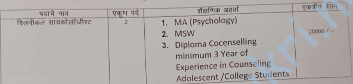 | या पदांसाठी भरती | चिकित्सालयीन मानसतज्ञ |