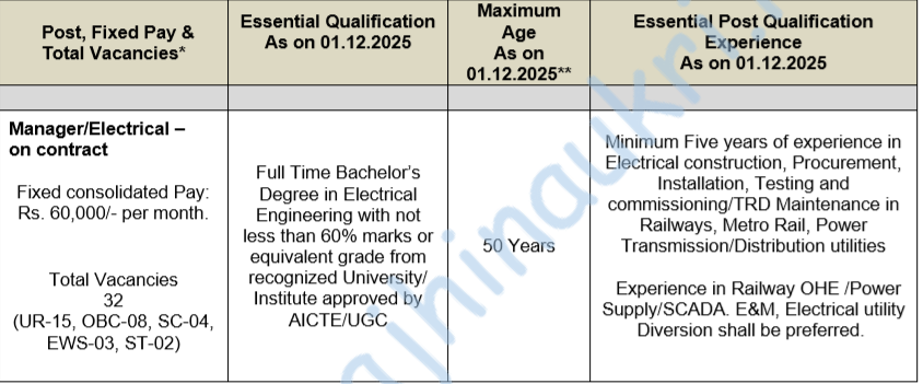 - Manager – i) Electrical ii) OHE iii) S&T – Rs. 60,000/- pm