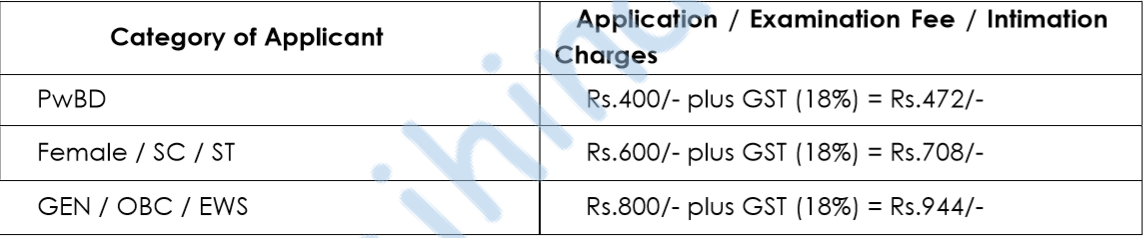 - अर्ज शुल्क – (अर्ज शुल्क भरणा प्रक्रियेविषयी सविस्तर माहितीसाठी तक्ता पहा/PDF/वेबसाईट पहा) –