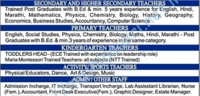 Jain School Recruitment 2024 – The Jain International School, Ch. Sambhajinagar invites Offline applications till last date 3/2/2024 to fill up posts of Teaching Staff. The job location is Ch. Sambhajinagar. The Official website & PDF/Advertise is given below.