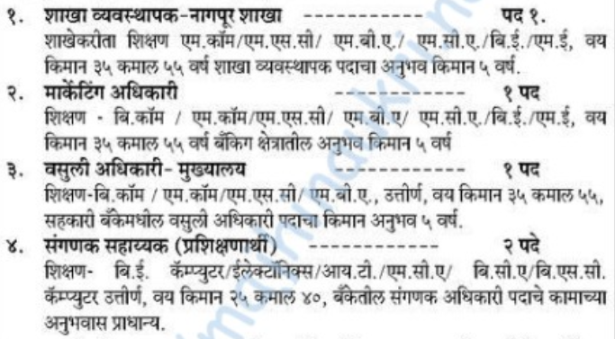 | या पदांसाठी भरती | १) शाखा व्यवस्थापक २) विपणन अधिकारी ३) वसुली अधिकारी ४) संगणक अधिकारी (प्रशिक्षणार्थी). |