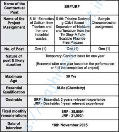 JNARDDC JRF/SRF Recruitment 2025 – Jawaharlal Nehru Aluminium Research Development & Design Center, Nagpur invites Offline applications in prescribed format & has arranged interview on date 18/11/2025 for the posts of Junior Research Fellow/Senior Research Fellow under different projects. There are total 3 vacancies. The job location is Nagpur. The Official website & PDF/Advertise is given below.