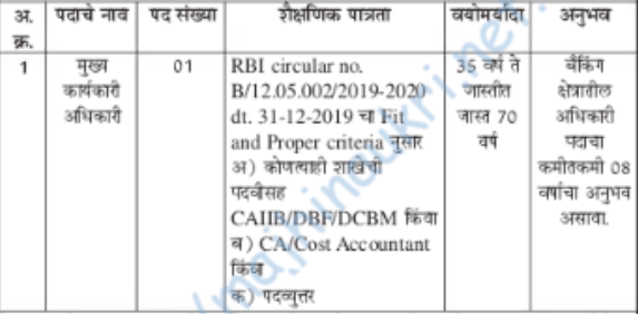 - १) शाखा व्यवस्थापक – ४० वर्षांपेक्षा अधिक नसावे.