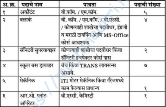 श्री पांडुरंग प्रतिष्ठान, पंढरपूर यांनी प्रसिद्ध केलेल्या जाहिराती नुसार त्यांच्याद्वारे संचलित कर्मयोगी शैक्षणिक संकुल, पंढरपूर येथे लेखापाल, लिपिक, सॅनिटरी सुपरवायझर, शालेय बसचालक, यांत्रिक आणि आर.टी.ओ. प्लांट ऑपरेटर पदभरतीसाठी दि. १८/१/२०२६ पर्यंत ऑनलाईन/ऑफलाईन अर्ज मागवण्यात येत आहेत. या भरती अंतर्गत एकूण २० जागा आहेत. अधिकृत वेबसाईट आणि PDF जाहिरात लिंक खाली दिलेली आहे. “माझी नोकरी” या लिंक वरून टेलिग्राम चॅनल लगेच जॉईन करा.