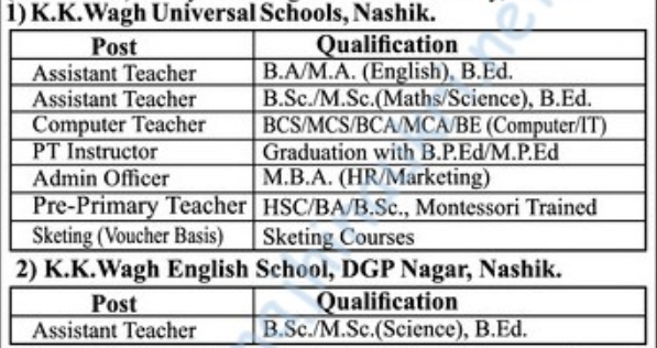 के. के. वाघ एज्युकेशन सोसायटी, नाशिक यांनी प्रसिद्ध केलेल्या जाहिराती नुसार त्यांच्या अंतर्गत युनिव्हर्सल स्कूल आणि इंग्लिश स्कूल येथे विविध शैक्षणिक पदभरतीसाठी मुलाखतीस उपस्थित राहू न शकणाऱ्या उमेदवारांकडून दि. १०/१२/२०२५ पर्यंत ऑनलाईन अर्ज मागवण्यात येत आहेत आणि दि. ७/१२/२०२५ रोजी मुलाखत आयोजित केली आहे. अधिकृत वेबसाईट आणि PDF जाहिरात लिंक खाली दिलेली आहे. “माझी नोकरी” या लिंक वरून टेलिग्राम चॅनल लगेच जॉईन करा