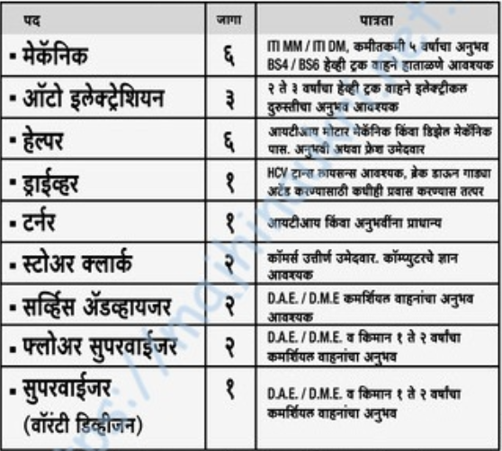 - मुलाखतीचे ठिकाण – लक्ष्मी ऑटो सर्व्हिसेस प्रायव्हेट लिमिटेड, १०४/२, पुना रोड, बाळे, हॉटेल जंगलीसमोर, सोलापूर.