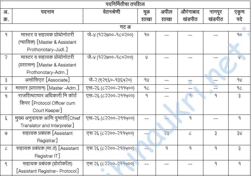 विधि व न्याय विभाग, महाराष्ट्र शासन, मंत्रालय, मुंबई यांनी प्रसिद्ध केलेल्या जाहिराती नुसार मुंबई उच्च न्यायालयाच्या मूळ आणि अपील शाखा तसेच नागपूर आणि छत्रपती संभाजीनगर खंडपीठ येथे विविध गट अ ते गट ड पदभरतीसाठी विहित नमुन्यातील अर्ज मागवण्यात येत आहेत. या भरती अंतर्गत एकूण २२२८ जागा आहेत. अधिकृत वेबसाईट आणि PDF जाहिरात लिंक खाली दिलेली आहे. “माझी नोकरी” या लिंक वरून टेलिग्राम चॅनल लगेच जॉईन करा.