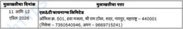 एल अँड टी फायनान्स लिमिटेड यांनी प्रसिद्ध केलेल्या जाहिराती नुसार गोंदिया, भंडारा आणि गडचिरोली जिल्हा येथे क्षेत्र अधिकारी, शाखा प्रक्रिया व्यवस्थापक, शाखा व्यवस्थापक आणि प्रांत व्यवस्थापक पदभरतीसाठी दि. ११/४/२०२६ आणि दि. १२/४/२०२६ रोजी मुलाखत आयोजित केली आहे. अधिकृत वेबसाईट आणि PDF जाहिरात लिंक खाली दिलेली आहे. “माझी नोकरी” या लिंक वरून टेलिग्राम चॅनल लगेच जॉईन करा.