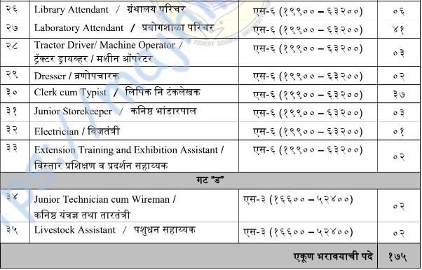 निबंधक, महाराष्ट्र पशु व मत्स्य विज्ञान विदयापीठ, नागपूर यांनी प्रसिद्ध केलेल्या जाहिराती नुसार त्यांच्या अंतर्गत विद्यापीठ मुख्यालय, घटक पशुवैद्यकीय, दुग्ध तंत्रज्ञान, मत्स्य विज्ञान महाविद्यालये, पशु पैदास प्रक्षेत्रे आणि इतर संस्था यांच्या आस्थापनेवर विविध गट ब/क/ड संवर्ग शिक्षकेतर पदभरतीसाठी दि. २०/३/२०२६ पर्यंत विहित नमुन्यातील ऑनलाईन अर्ज मागवण्यात येत आहेत. या भरती अंतर्गत एकूण १७५ जागा आहेत. अधिकृत वेबसाईट आणि PDF जाहिरात लिंक खाली दिलेली आहे. “माझी नोकरी” या लिंक वरून टेलिग्राम चॅनल लगेच जॉईन करा