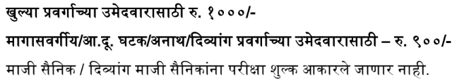 • अर्ज शुल्क – रु. २०००/- (खुला प्रवर्ग) आणि रु. १०००/- (आरक्षण वर्ग). (अर्ज शुल्क भरणा प्रक्रियेविषयी सविस्तर माहितीसाठी जाहिरात/PDF/वेबसाईट पहा)