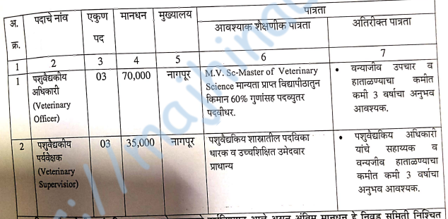 नागपूर वनविभाग, नागपूर येथे B.V.Sc/M.V.Sc. शिक्षितांसाठी रु. ५०,०००/- दरमहा वेतनावर पशुवैदयकीय अधिकारी आणि रु. २७,०००/- दरमहा वेतनावर पशुवैदयकीय पर्यवेक्षक पदांच्या एकूण ४ भरतींसाठी अर्जाची सूचना