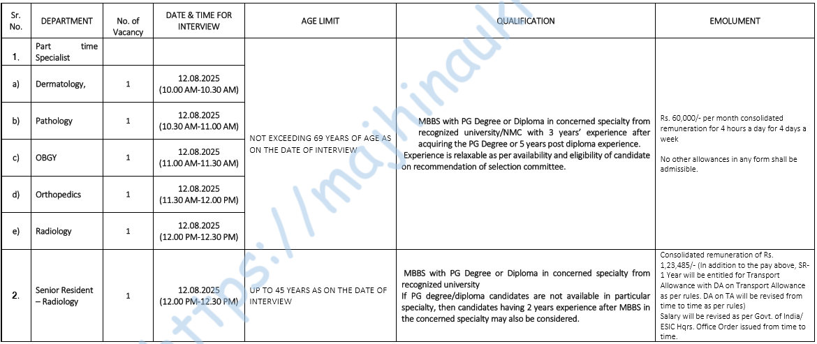 • For all the details of each post, terms & conditions, application procedure, documents required along with application form, experience, selection procedure see advertise/refer PDF/visit website – https://www.esic.gov.in/.
