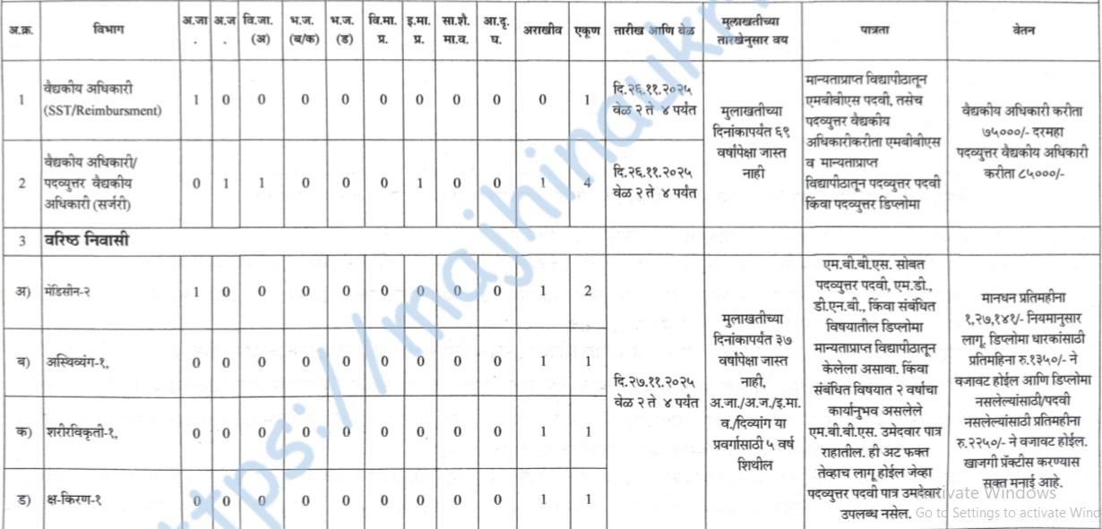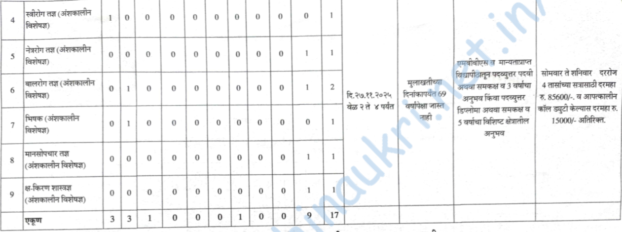 | मुलाखतीची तारीख आणि वेळ | दि. २६/११/२०२५ आणि दि. २७/११/२०२५ दुपारी २.०० ते दुपारी ४.००. (सविस्तर माहितीसाठी तक्ता पहा/PDF/वेबसाईट बघावी) |