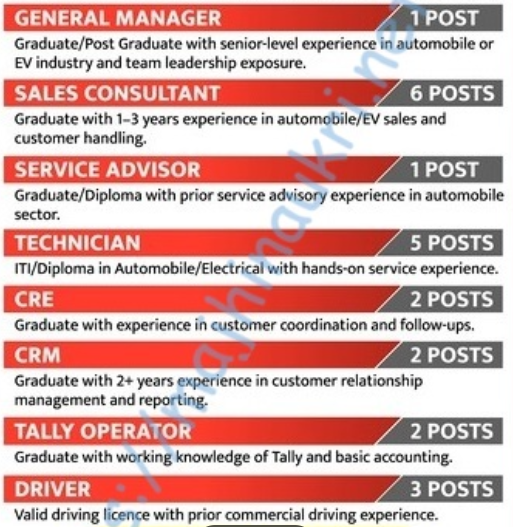 Montra Electric Vehicles Recruitment 2026 – Padmaraman Vyankateshwar Trading Pvt. Ltd., Nagpur has arranged interview on date 5/1/2026, 6/1/2026 & 7/1/2026 to fill up posts of General Manager, Sales Consultant, Service Advisor, CRE, CRM, Tally Operator, Technician & Driver. There are total 16 vacancies. The job location is Nagpur. The Official website & PDF/Advertise is given below.