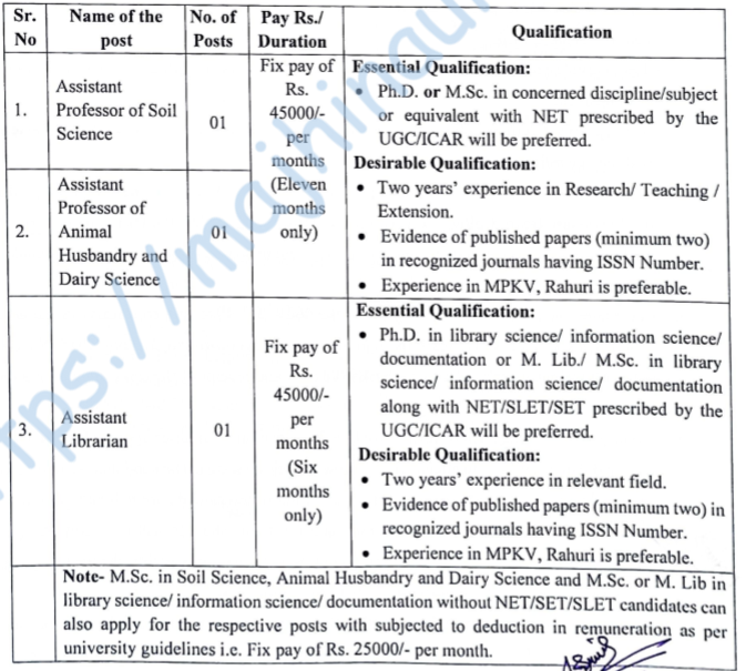 • For detailed information about the selection procedure, terms & conditions, application procedure, prescribed format application form, other instructions, etc. about the above posts ref. PDF/visit website – http://mpkv.ac.in/.