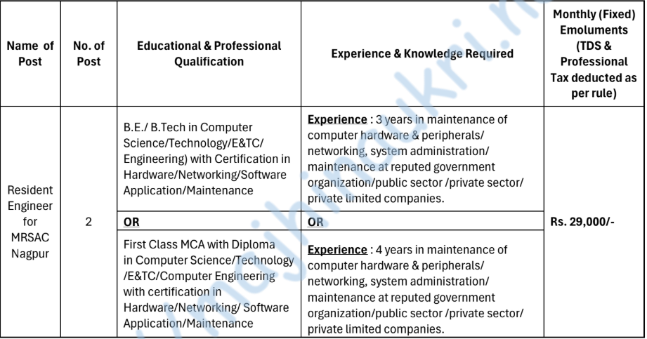 • For post, terms & conditions, subject and reservation, requisite qualification, experience, selection procedure, application procedure, prescribed application format, other details ref. PDF/visit website –www.mrsac.gov.in.