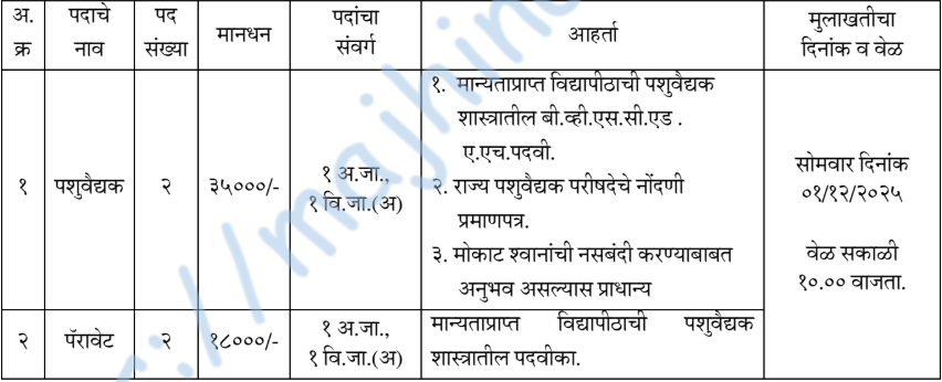 उपआयुक्त तथा संचालक, घनकचरा व्यवस्थापन विभाग, नागपूर महानगरपालिका, नागपूर यांनी प्रसिद्द केलेल्या जाहिराती नुसार त्यांच्या अंतर्गत पशुवैदयकीय सेवा कक्ष येथे पशुवैदयक आणि निमपशुवैदयक पदभरतीसाठी विहित नमुन्यातील ऑफलाईन अर्ज मागवून दि. ०१/१२/२०२५ रोजी मुलाखत आयोजित केली आहे. या भरती अंतर्गत एकूण  जागा आहेत. अधिकृत वेबसाईट आणि PDF जाहिरात लिंक खाली दिलेली आहे. “माझी नोकरी” या लिंक वरून टेलिग्राम चॅनल लगेच जॉईन करा