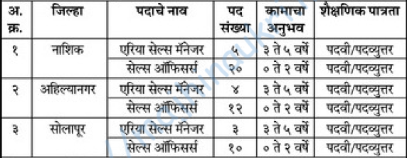 | या पदांसाठी भरती | १) विक्री अधिकारी २) क्षेत्र विक्री व्यवस्थापक |
