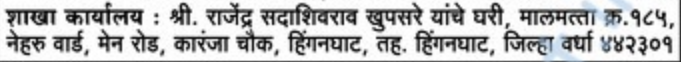 - Venue – Navin Subhedar Nagari Sahakari Patsanstha Maryadit, Hinganghat Branch, Shri. Rajendra Sadashivrao Kupsare, Estate No. 185, Nehru Ward, Main Road, Karanja Square, Hinganghat, Dist. Wardha – 442301.