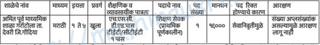 या पदांसाठी भरती शिक्षण सेवक – शैक्षणिक पात्रता आणि अनुभव शैक्षणिक पात्रताकरिता तक्ता पहा/जाहिरात बघावी. एकूण पद संख्या २ जागा नोकरीचे ठिकाण गोंदिया जिल्हा मुलाखतीची तारीख आणि वेळ दि. २९/०९/२०२४ दुपारी १२.०० ते दुपारी ४.०० वाजेपर्यंत. मुलाखतीचे ठिकाण नितीन शिक्षण संस्था, नवेगाव बांध को-ऑप. बॅंकेजवळ, ता. अर्जुनी/मोर., जि. गोंदिया