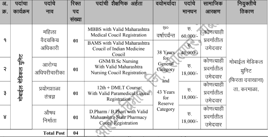 जिल्हा एकात्मिक आरोग्य आणि कुटुंब  सोसायटी, जिल्हा परिषद, सोलापूर यांनी प्रसिद्ध केलेल्या जाहिराती नुसार राष्ट्रीय आरोग्य अभियान अंतर्गत मोबाईल मेडिकल युनिटसाठी करमाळा, जि. सोलापूर येथे वैदयकीय अधिकारी-स्त्री, एएनएम/अधिपरिचारिका, प्रयोगशाळा तंत्रज्ञ आणि औषधनिर्माता पदभरतीसाठी दि. ९/४/२०२६ विहित नमुन्यातील ऑफलाईन अर्ज मागवण्यात येत आहेत.या भरती अंतर्गत एकूण ४ जागा आहेत. अधिकृत वेबसाईट आणि PDF जाहिरात लिंक खाली दिलेली आहे. “माझी नोकरी” या लिंक वरून टेलिग्राम चॅनल लगेच जॉईन करा