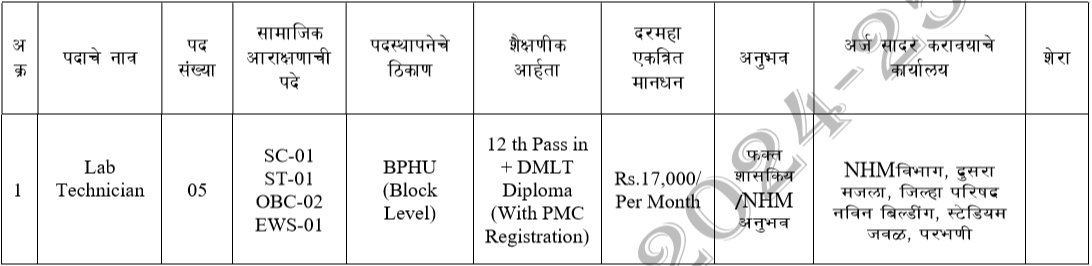 NHM 15th FC जि. प. परभणी – ५ प्रयोगशाळा तंत्रज्ञ पदांसाठी अर्ज करा !